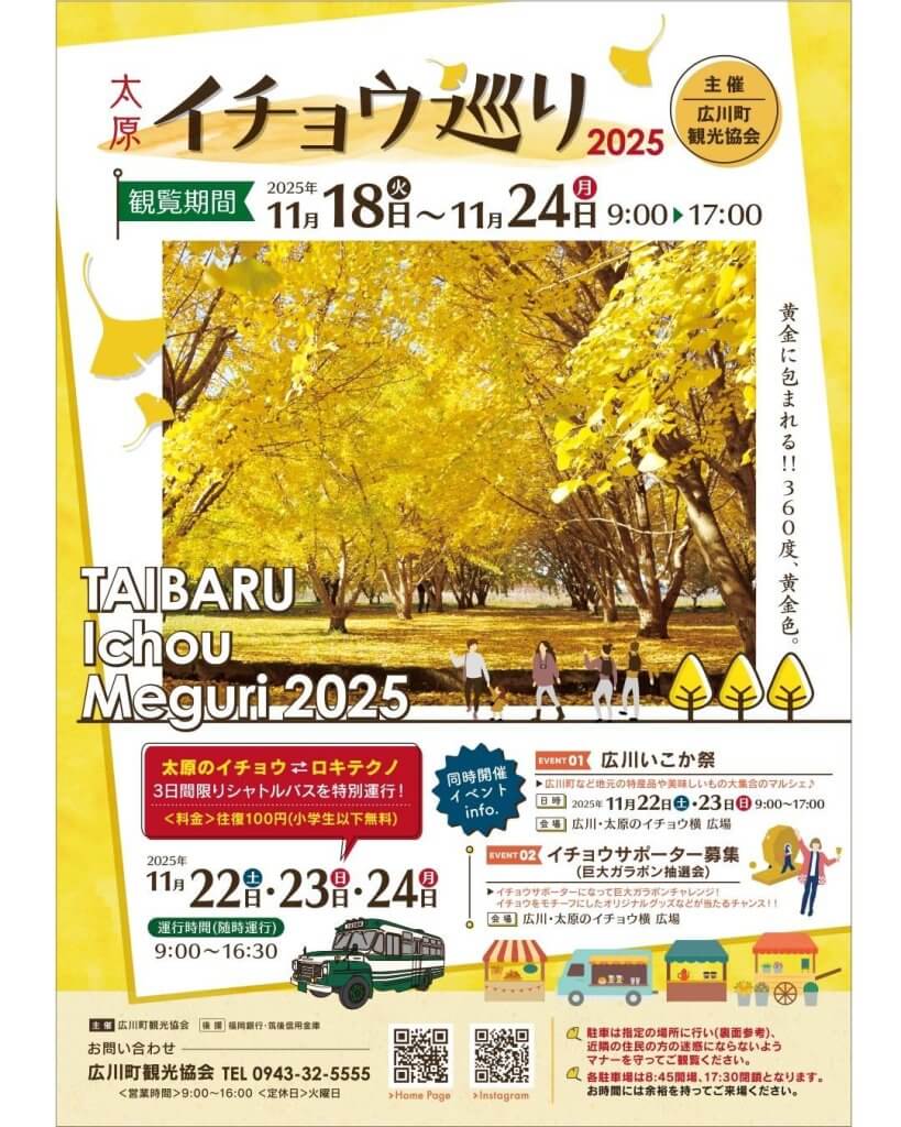 2025年シーズン 広川町太原(たいばる)のイチョウ観覧について 【2025年太原のイチョウ観覧情報】■観覧期間 令和7年11月18日(火)~24(月)■観覧時間 9:00~17:00※期間外の立入不可、駐車場なし。※色づき具合は予測が困難なため、観覧期間の色づきについては責任を負いかねます。※観覧期間の設定は、イチョウの養生と保全のためですので、ご理解とご協力をお願いいたします。 ■駐車場開場時間 8:45~17:30※駐車は指定の場所に行い(マップ参照)、周辺土地への無断駐車や路上駐車は固くお断りします。 太原のイチョウは私有地です。地主さまのご厚意により観覧期間のみ開放していただいております。本来公園施設ではなく駐車場が無いため、観覧期間中は周辺の土地をお借りし対応しております。そのため、現地まで数百メートルの徒歩移動が必要であったり、十分な駐車台数が確保できないなどご迷惑をお掛けしますが、予めご理解の上ご観覧くださいますようお願い申し上げます。 団体バスでご観覧の方 平日にご観覧の方 土日祝にご観覧の方 イチョウ色づき状況